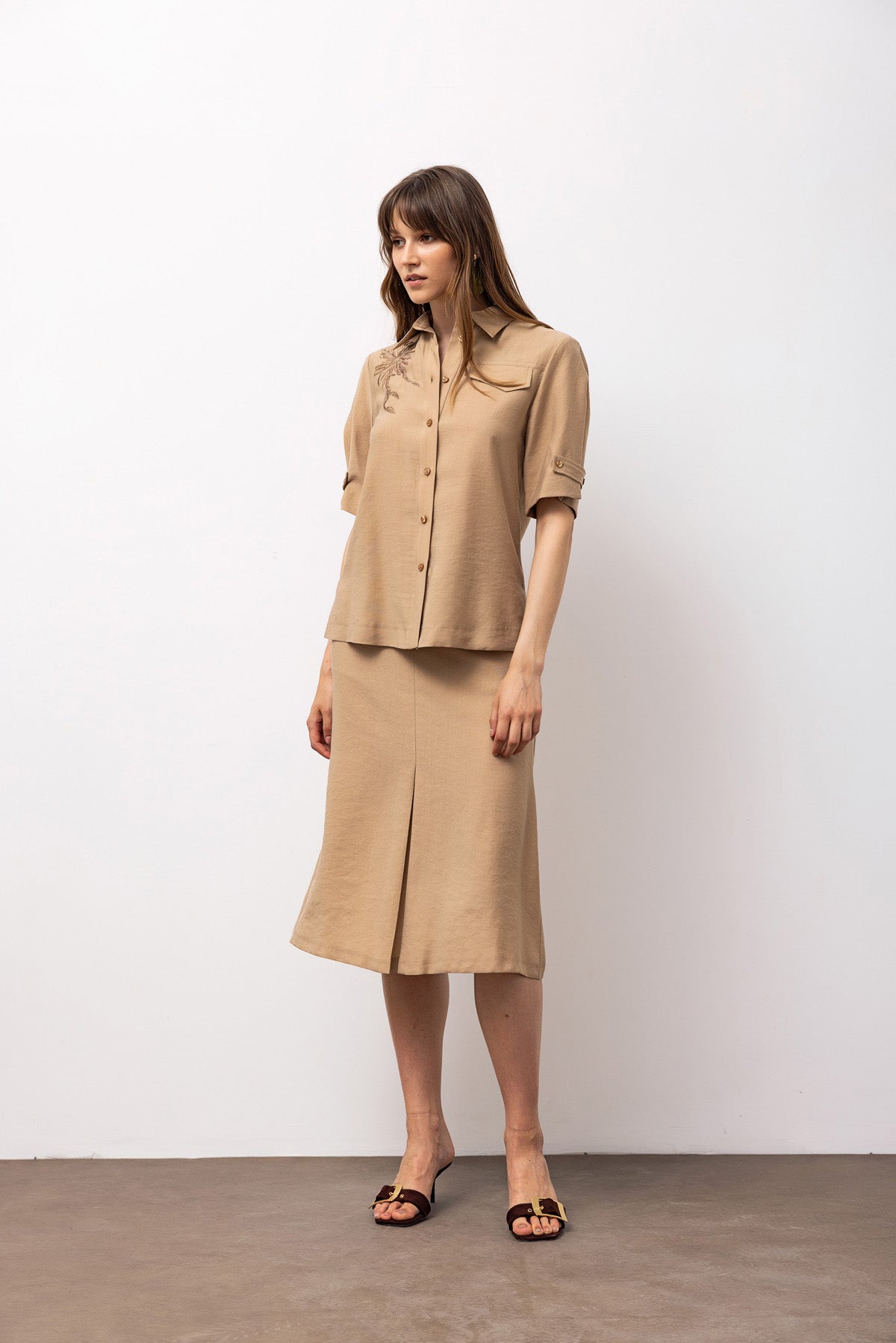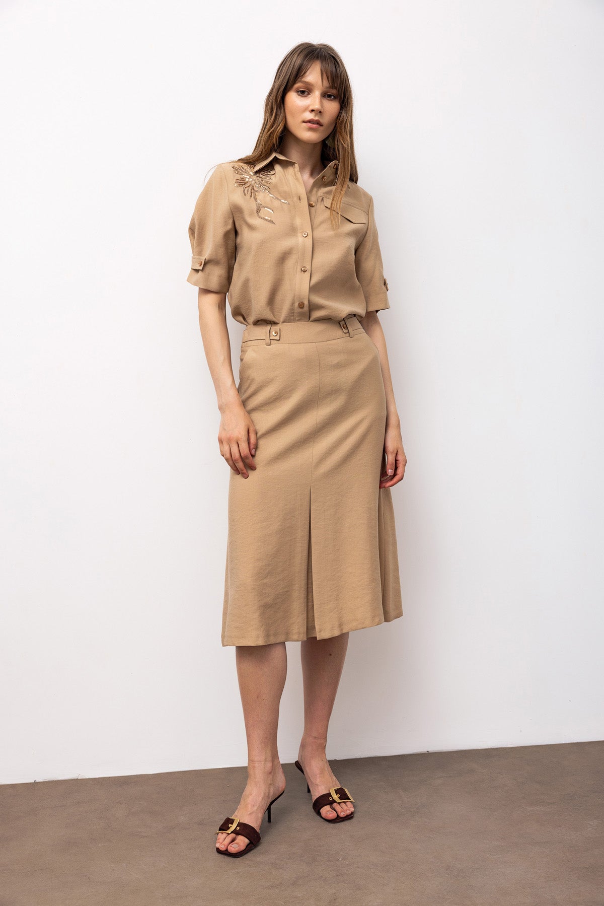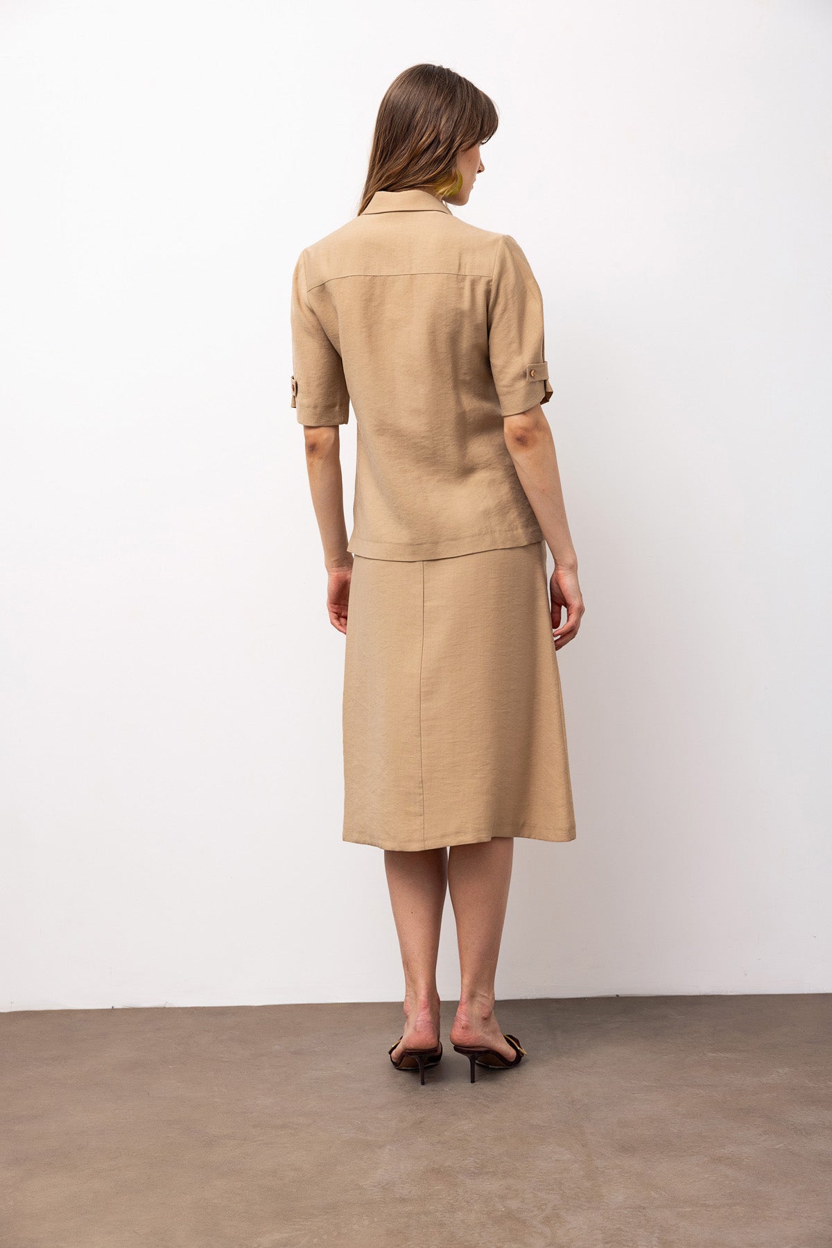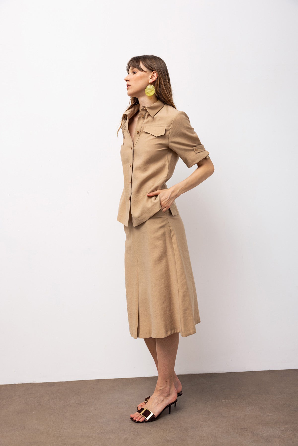 A-line midi skirt with a front pleat for ease of movement and flattering drape