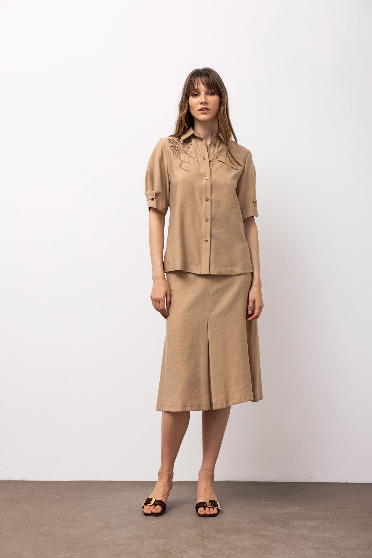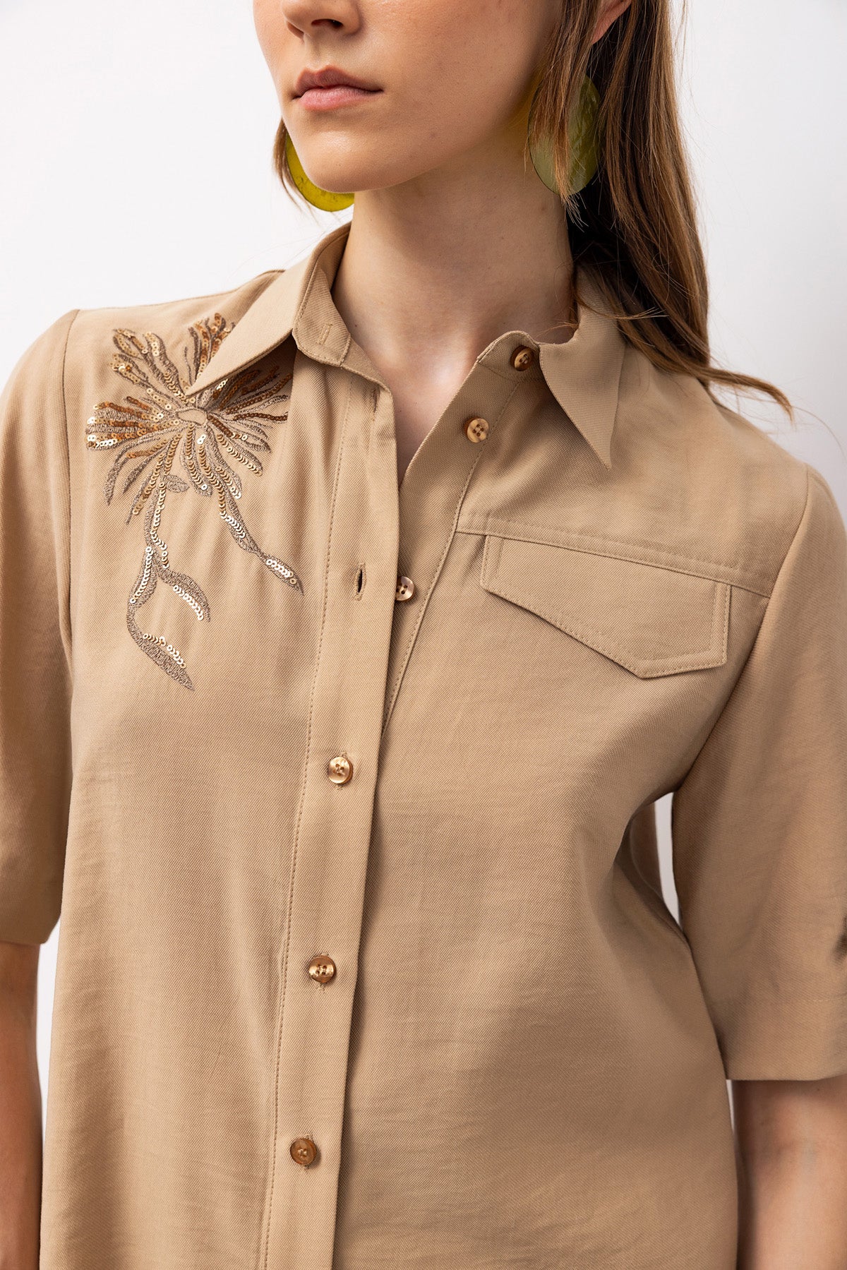 Button-up short-sleeve shirt with a classic collar and embroidered floral detail