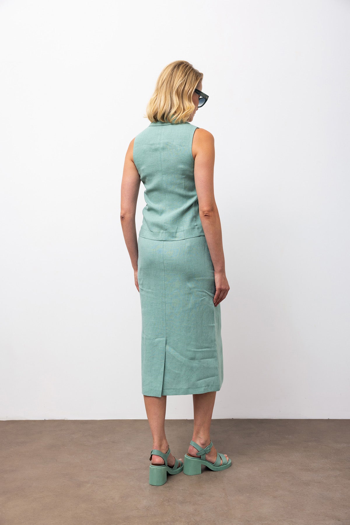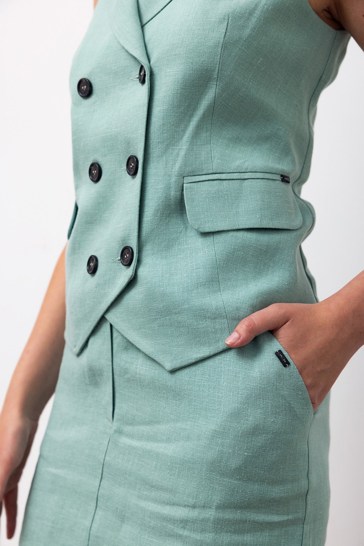 • Sleeveless cut with structured shoulders for a clean silhouette