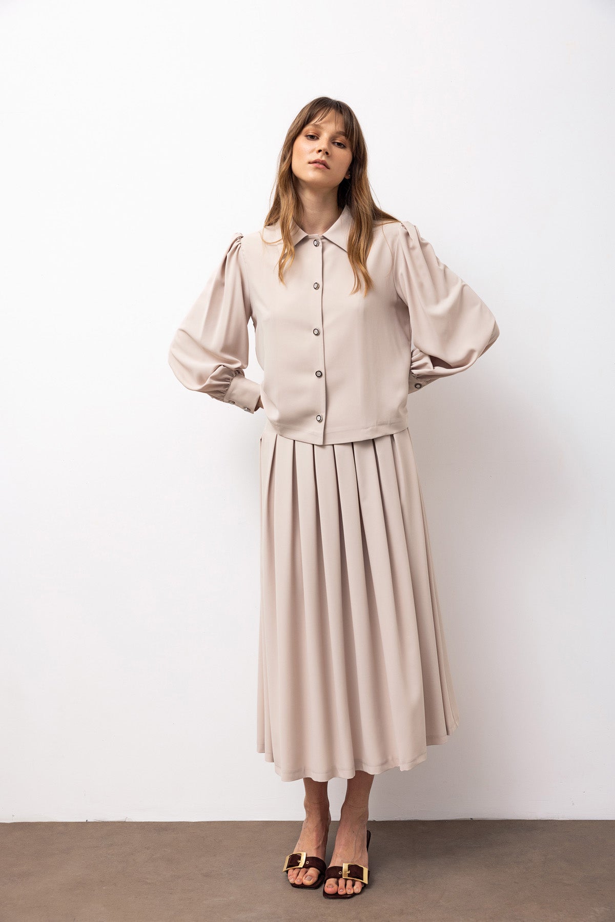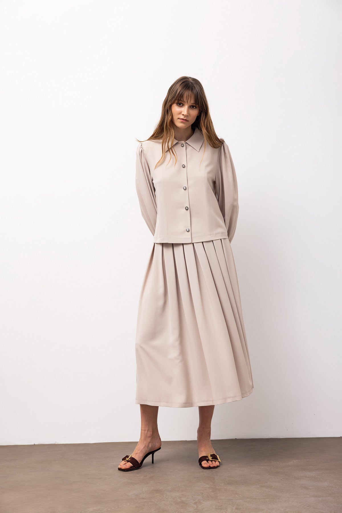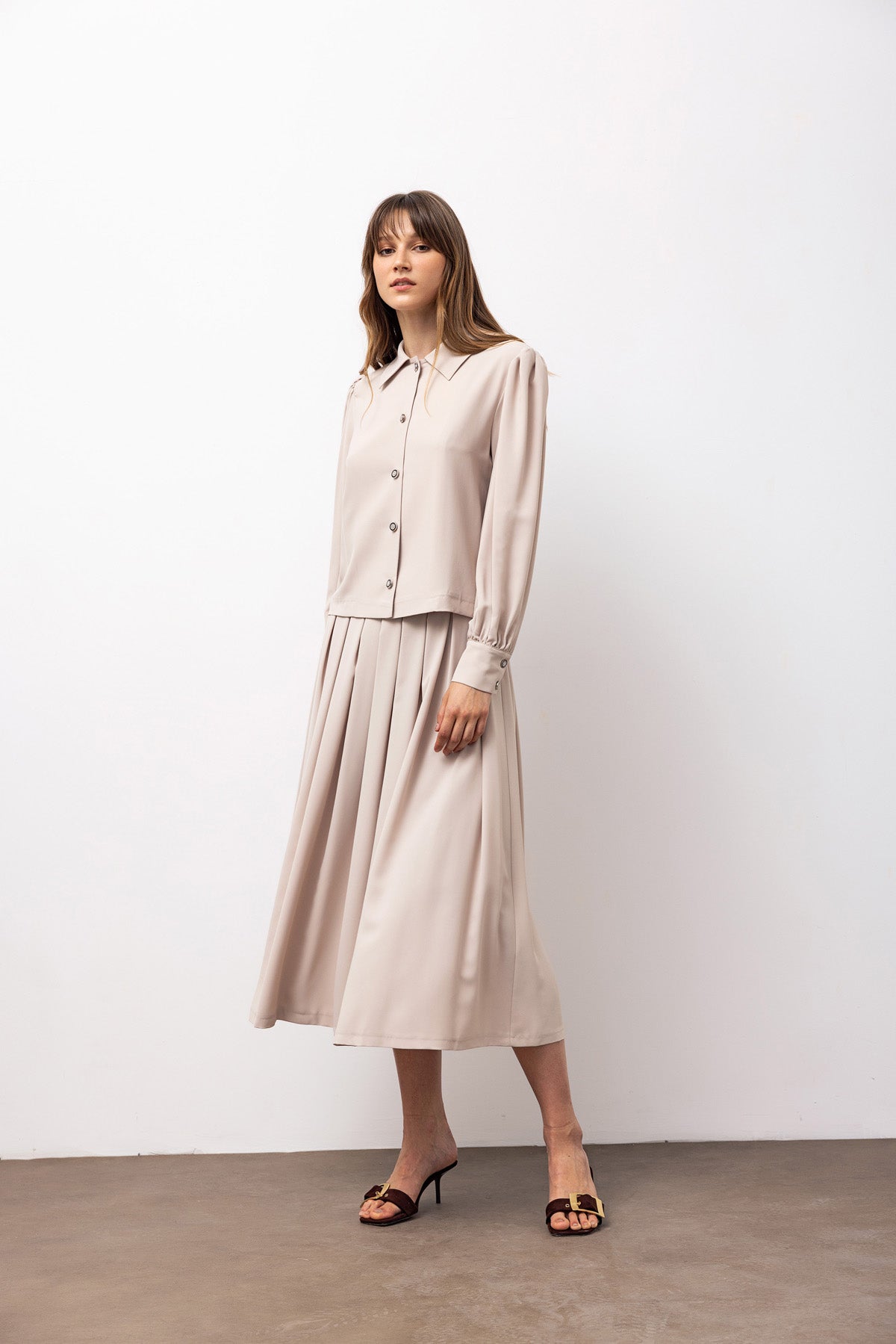 Buttoned Blouse & Pleated Midi Skirt Set - Beige