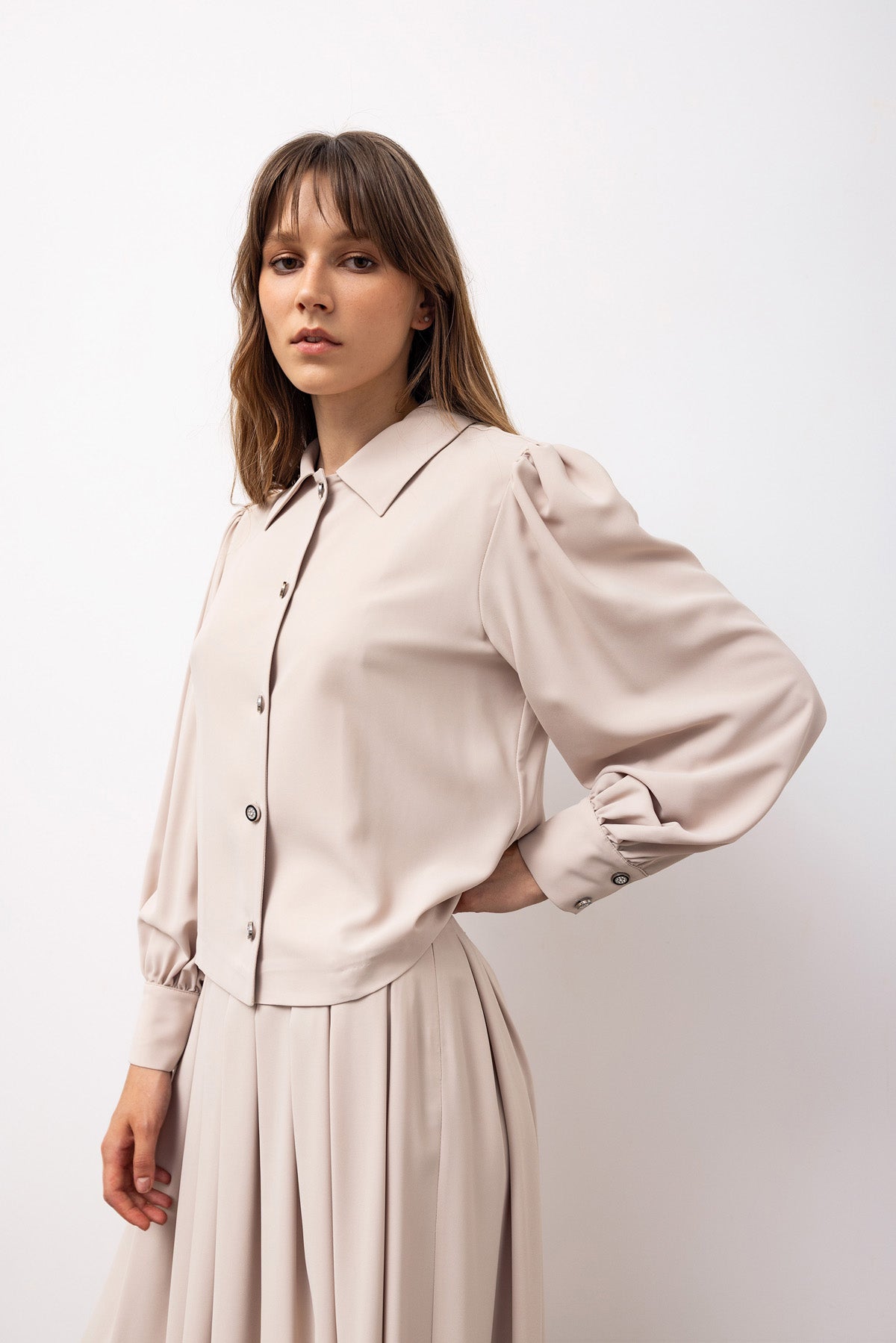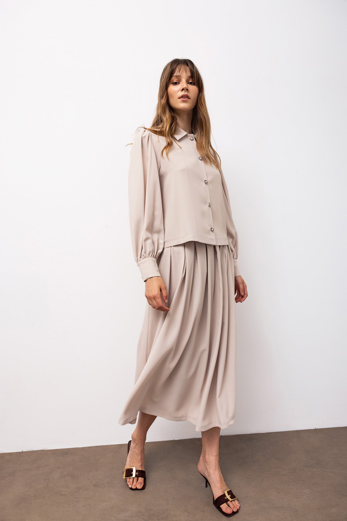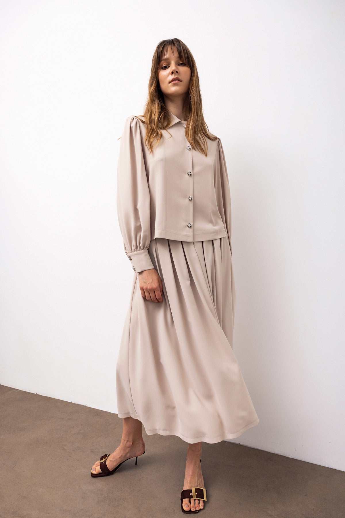Buttoned Blouse & Pleated Midi Skirt Set - Beige
