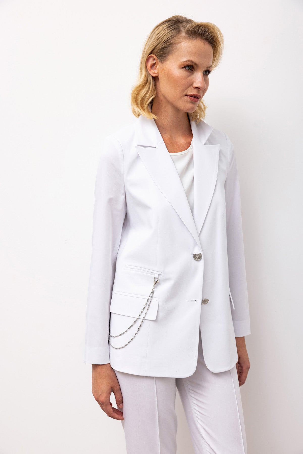 • Single-breasted blazer – features notched lapels, flap pockets, and tonal button closure