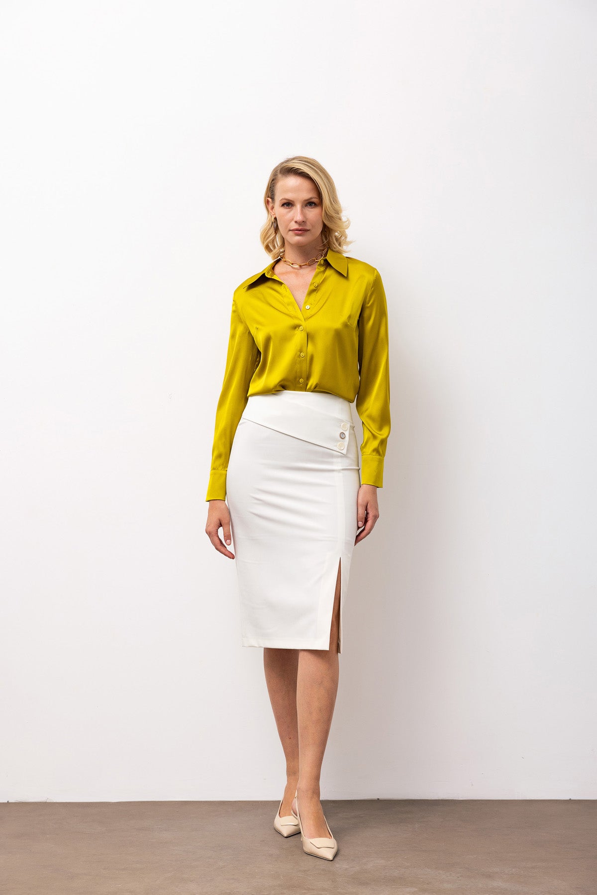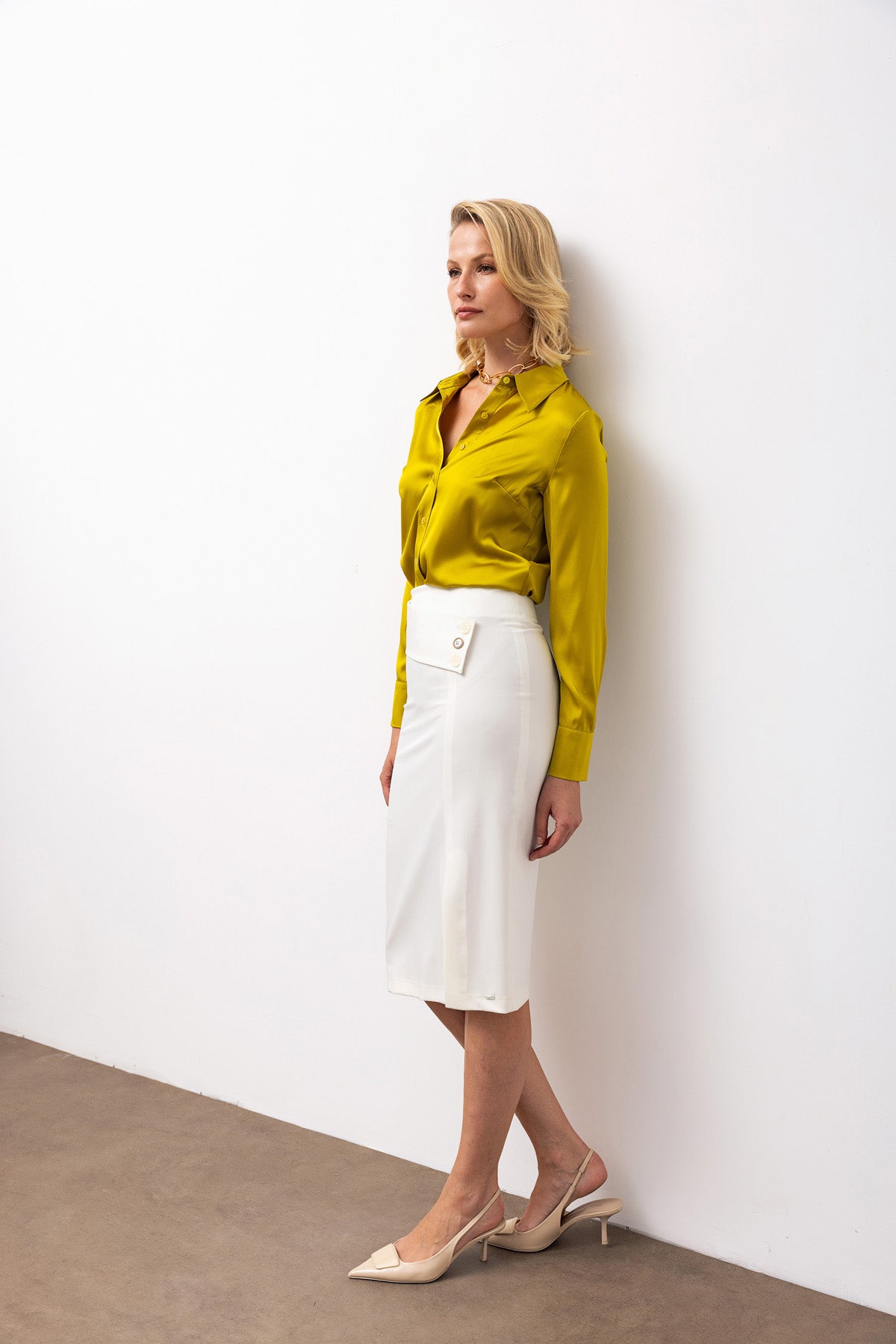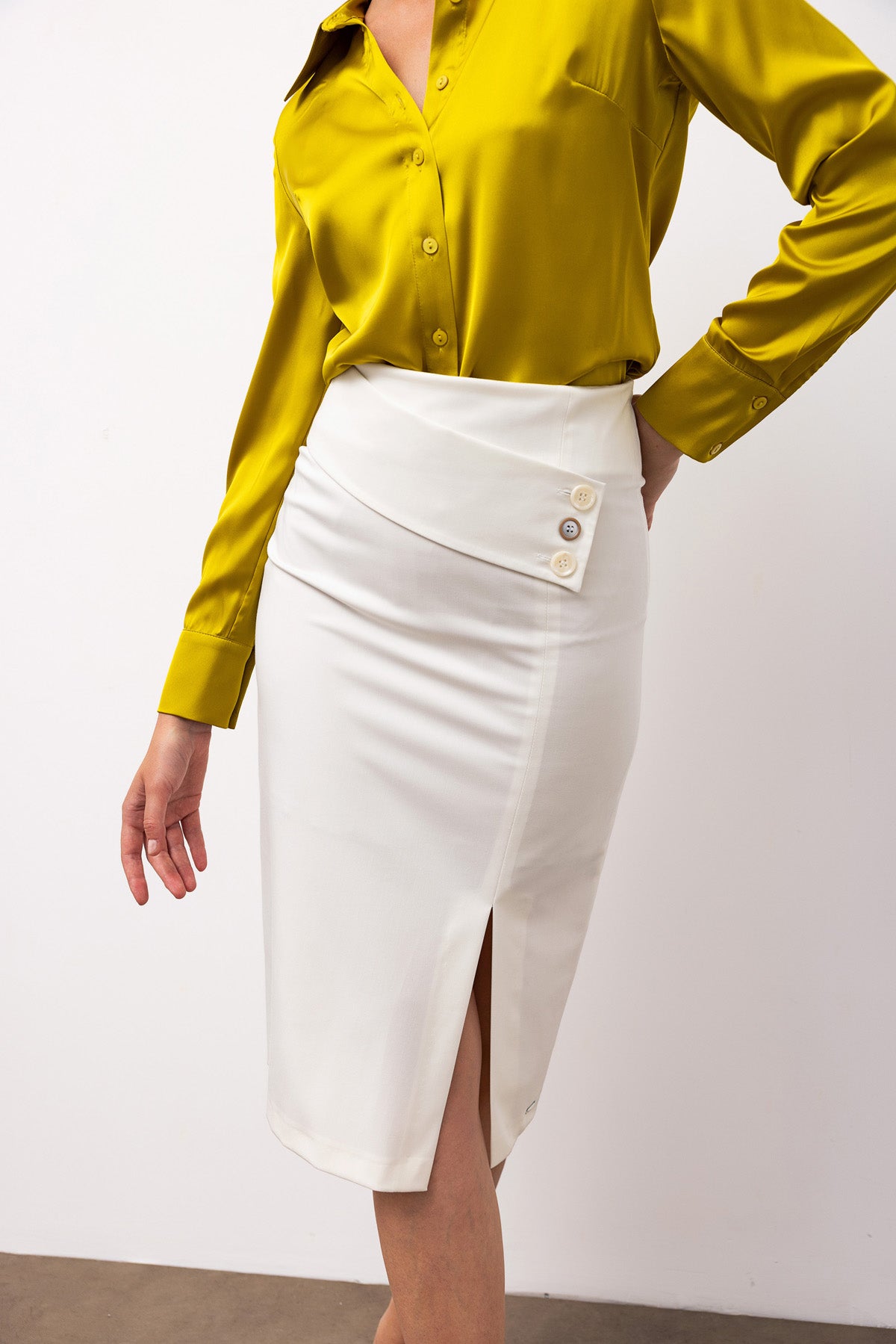 Yüksek Belli Yırtmaçlı Kalem Etek - Ekru