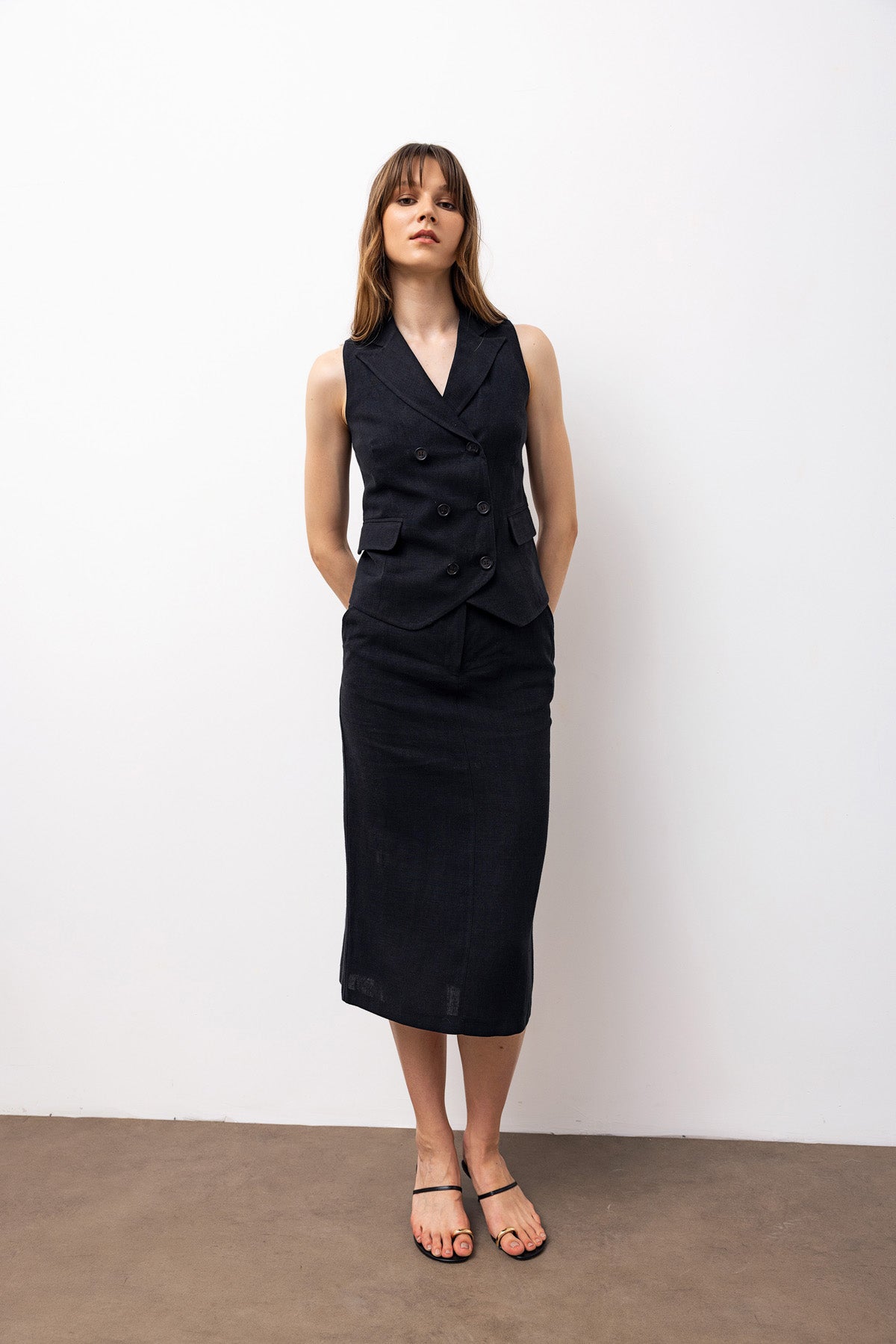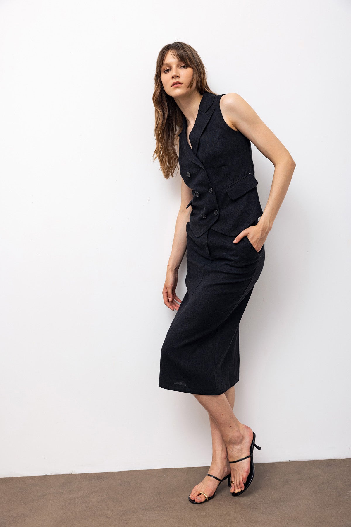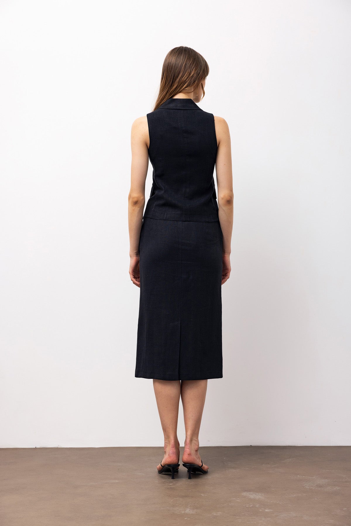 Dikiş Detaylı Keten Midi Etek – Siyah
