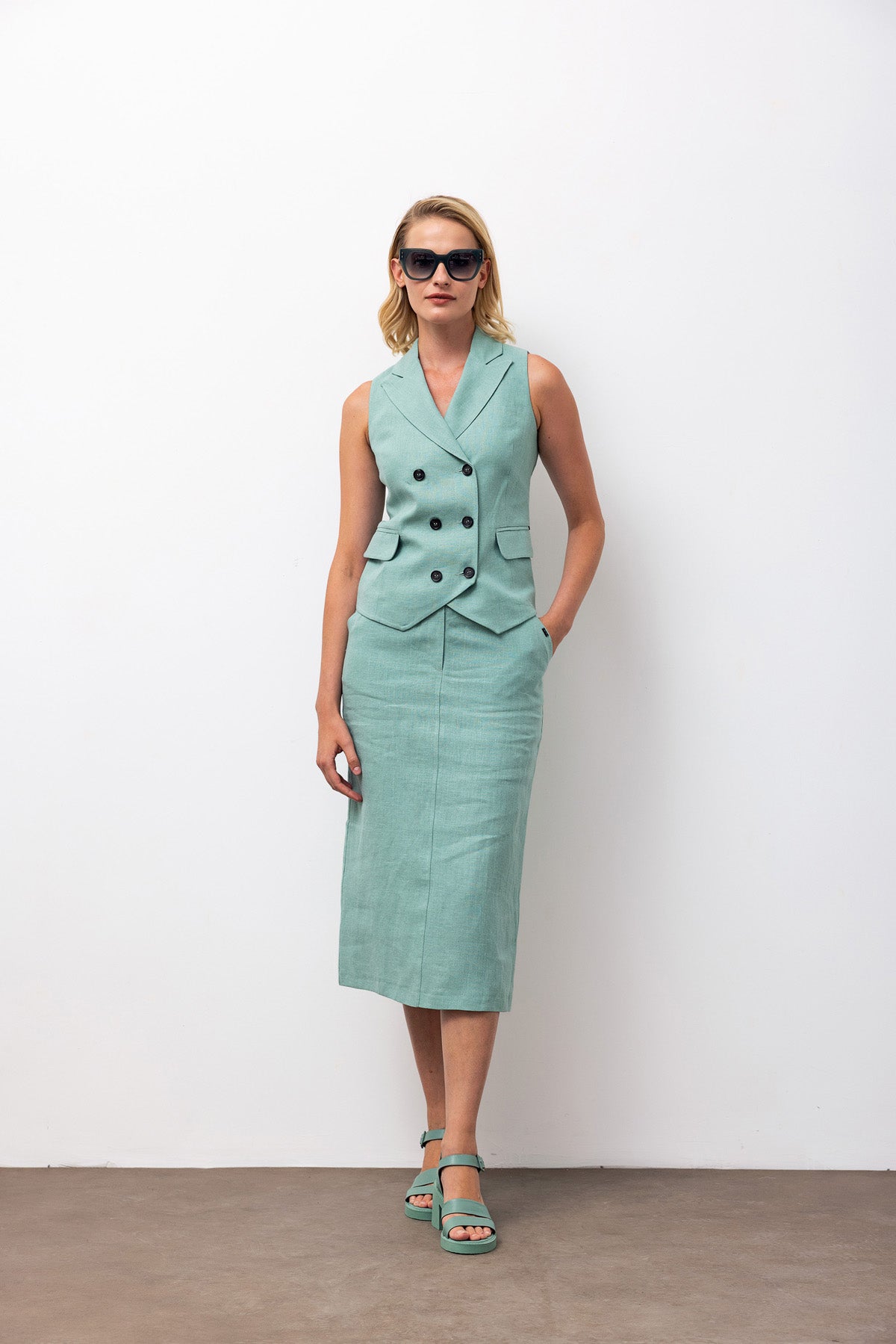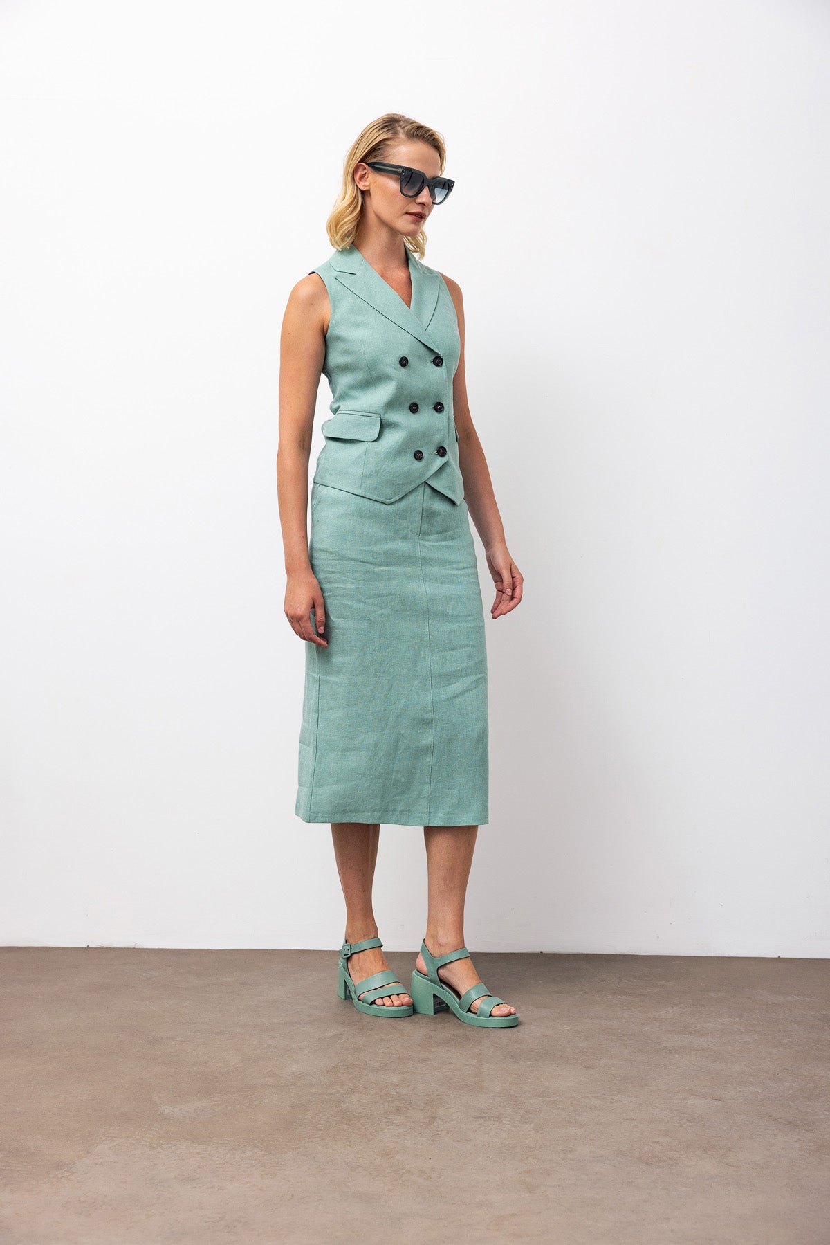 Dikiş Detaylı Keten Midi Etek – Nane Yeşili