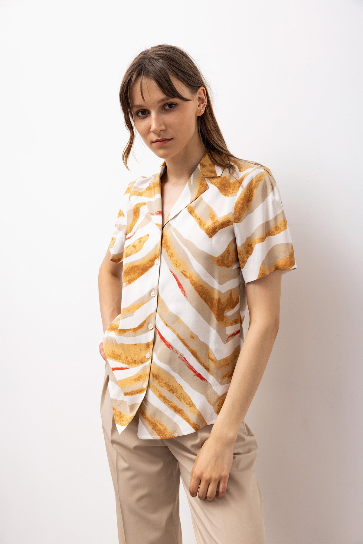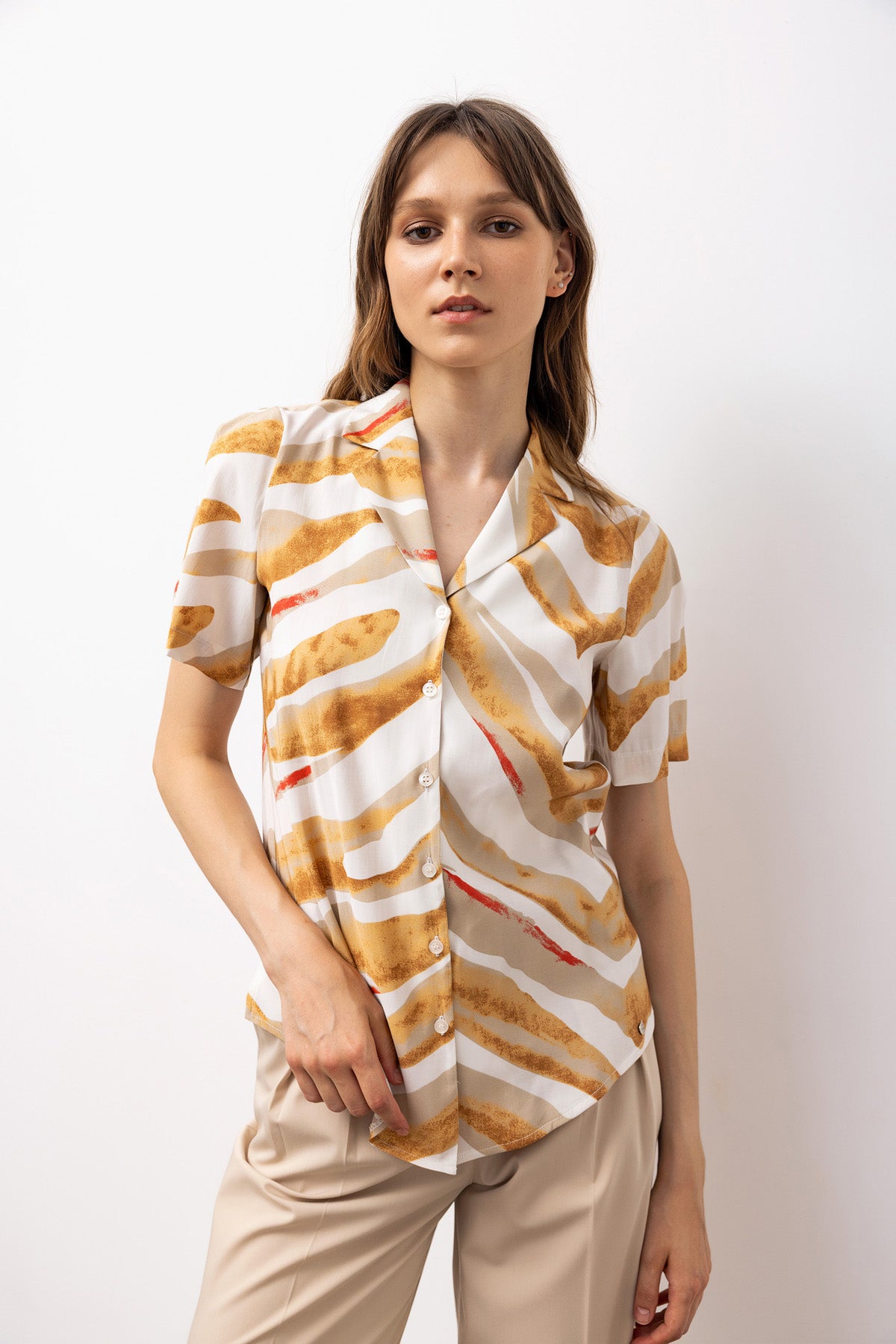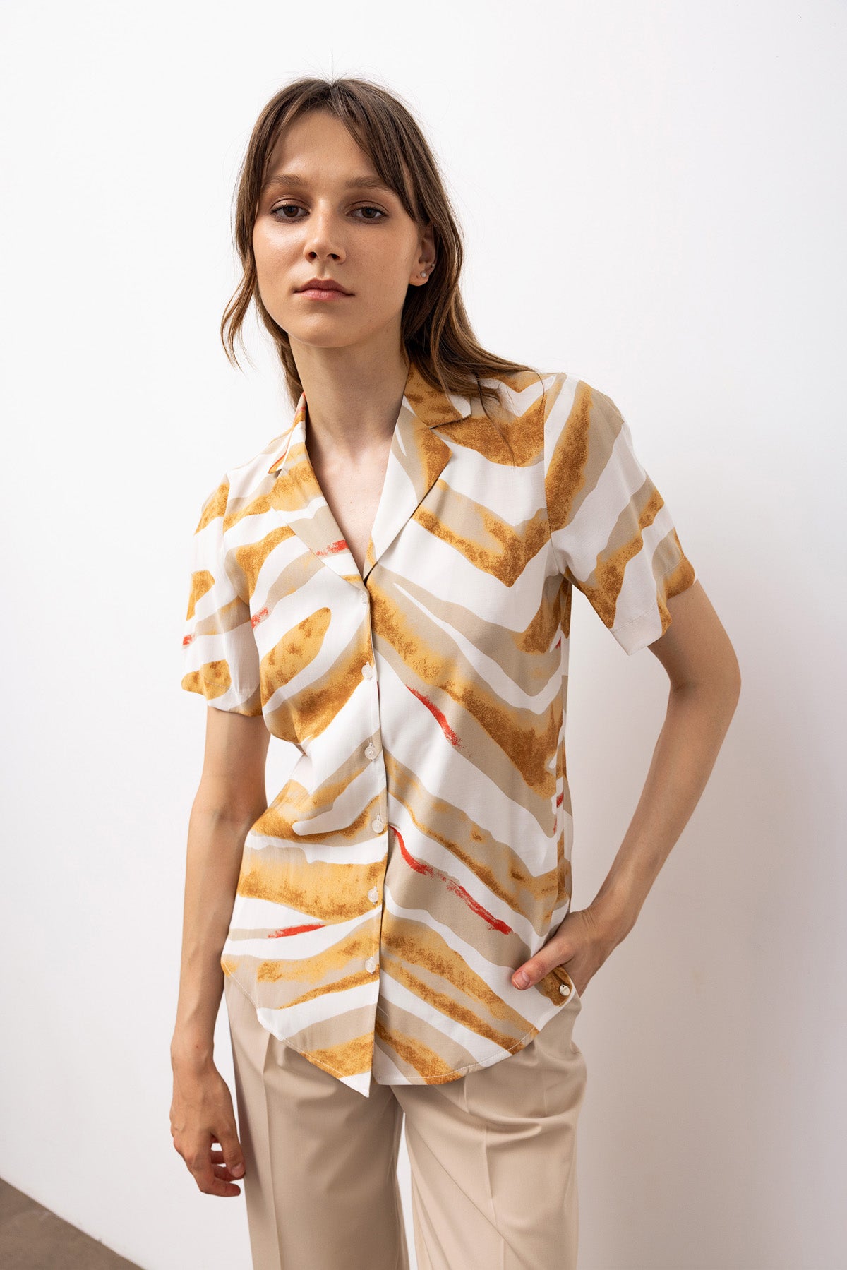 Fırça Darbesi Baskılı Viskon Gömlek – Bej