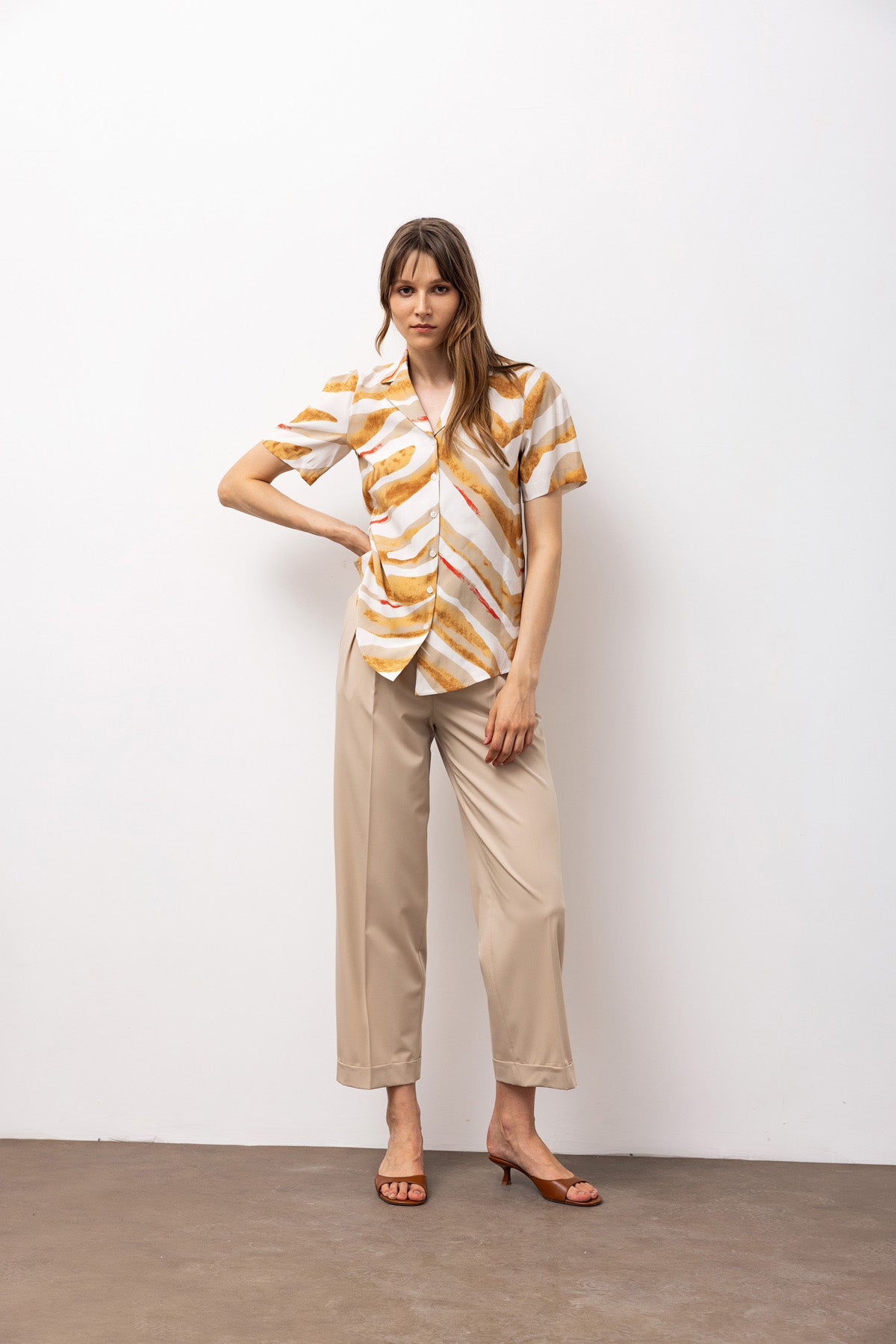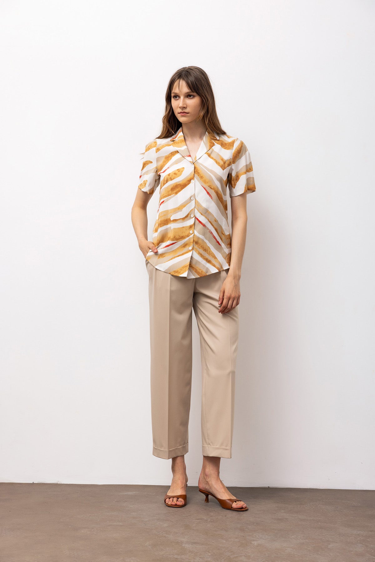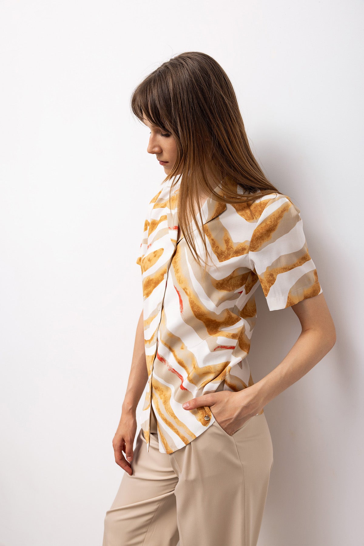 Fırça Darbesi Baskılı Viskon Gömlek – Bej